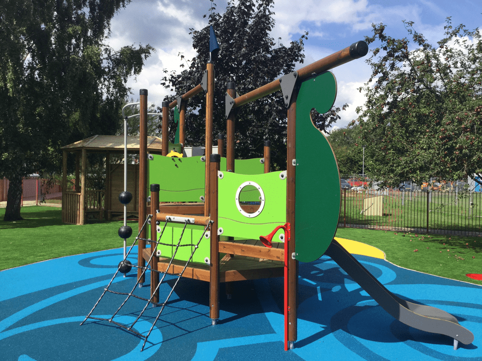Eight colours of wetpour and two colours of rubber mulch was used to create a variety of graphics over four areas, including a roadway with markings, leaf designs and intricate patterns around the play equipment area.