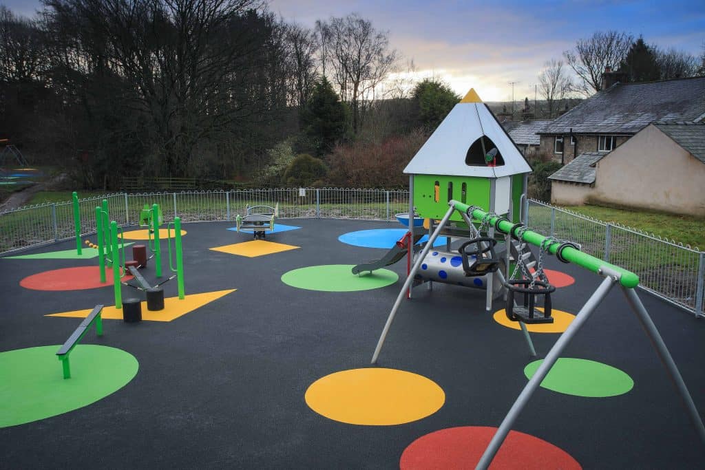Lower Bentham required a playful environment where children were safe to run around and explore in a safe and secure space. Wet pour was used to create a variety of brightly coloured shapes.