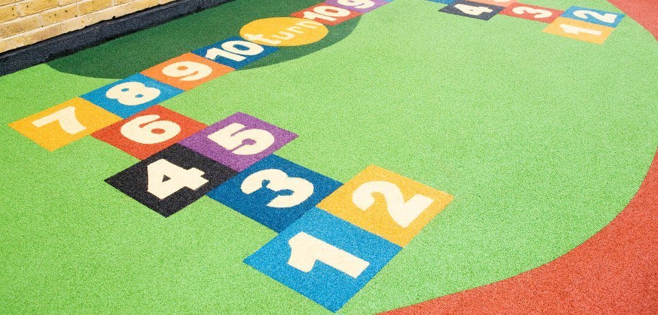 The finished install incorporated a wide variety of graphics for play and educational purposes, including number and letter games, turn hopscotch, mirror moves, and hop and skip games.