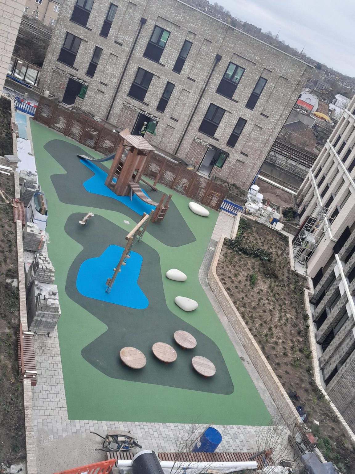 DCM recently contributed to the Higgs Yard project, a distinguished residential-led mixed-use development in London, by installing high-quality playground surfacing on a rooftop. This initiative focused on equipping the Higgs Yard rooftop playground with colored EPDM surfacing, engineered to create a secure and engaging play environment for children.