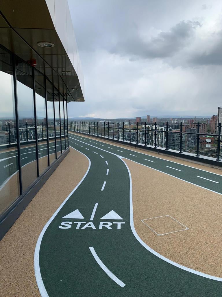 Cornbrook 15-Storey Apartment Development upgraded its rooftop with a functional, aesthetic running track to enhance resident recreation and fitness.