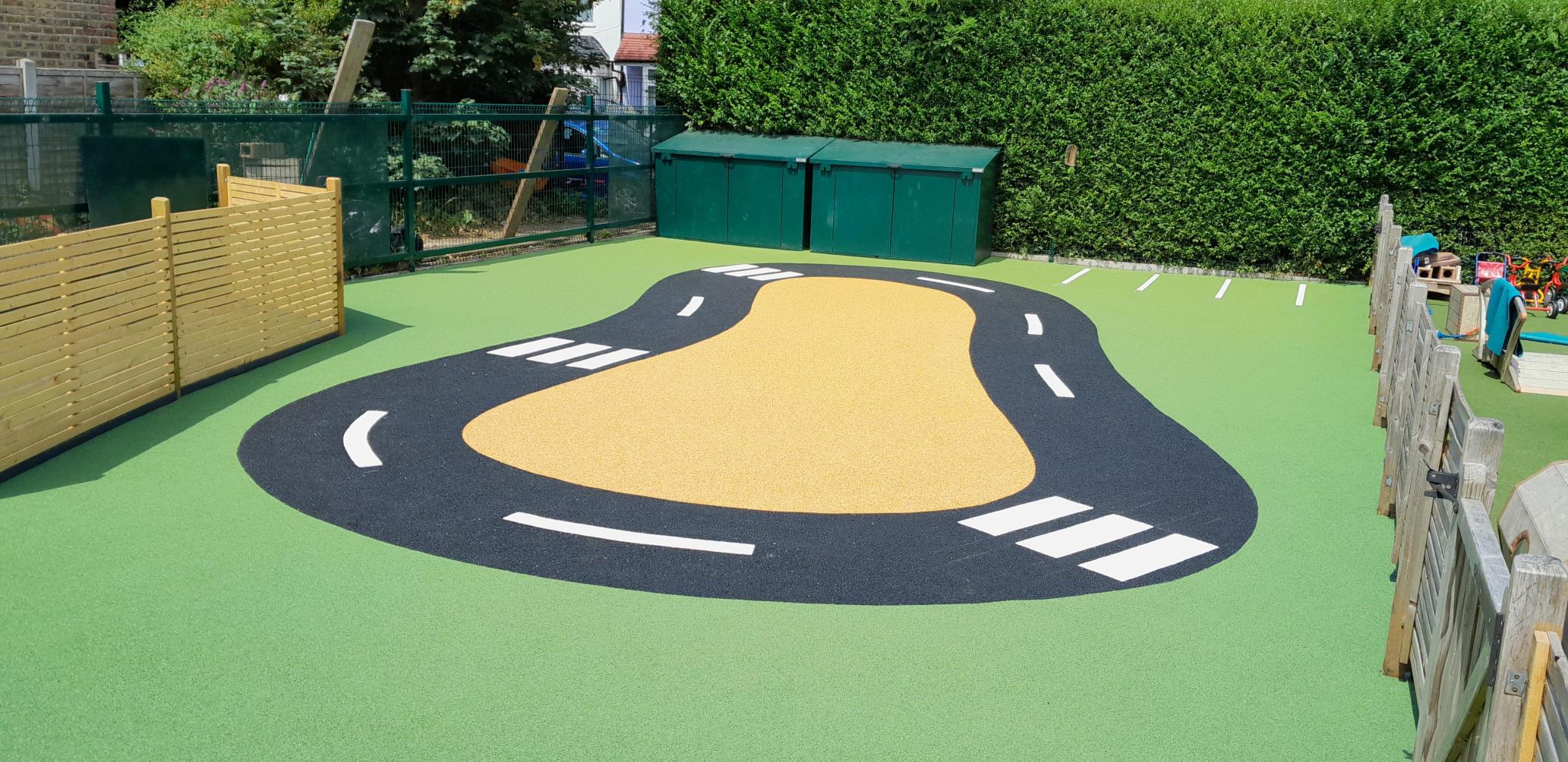 Wetpour was used to create a road track around the children’s play area at this residential property in Cheshire.